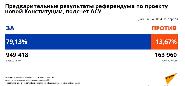 Предварительные итоги референдума по проекту новой Конституции, автоматически подсчитанные с помощью электронных урн, публикует Центральная комиссия по выборам и проведению референдумов КР. Результаты голосования, представленные в инфографике, не окончательные.