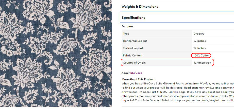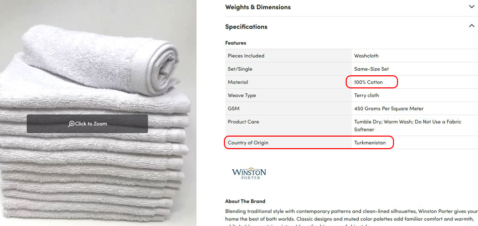 Запрещенные товары предлагаются, в частности, на торговой площадке Wayfair – одноименной корпорации из Бостона, штат Массачусетс. Там реализуют постельное белье из Туркменистана под брендом Ophelia and Co, полотенца под брендами Winston Porter, Ebern Designs, Samnm Trade и MSrugs (судя по этикетке, полотенца изготовлены на Ашхабадском текстильном комплексе), а также ткани под брендом RM Coco. Вся продукция имеется в наличии и может быть доставлена в течение нескольких дней.