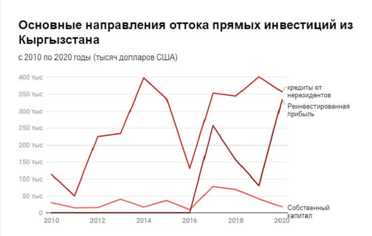 В сравнении с 2019 годом по всем категориям отмечалось снижение оттока, за исключением реинвестированной прибыли. В 2020 году инвесторы вывели из Кыргызстана в 4,1 раза больше чистого дохода (334 млн 97,9 тыс. долларов США) по сравнению с предыдущим годом. В Нацстаткоме объяснили это ростом выплаченных дивидендов в 2,6 раза.