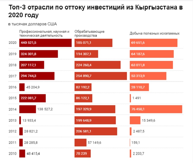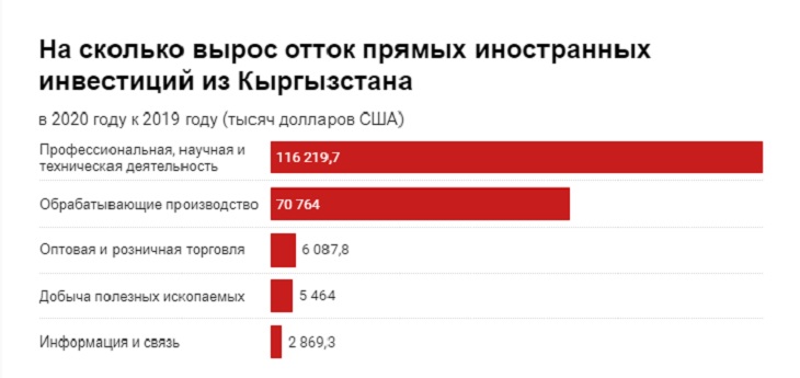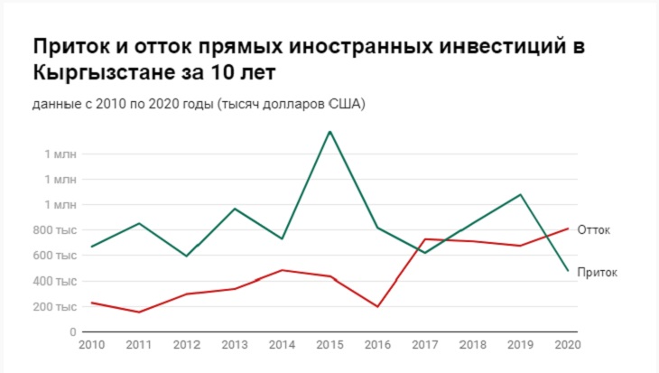 Настроение инвесторов нашло отражение в опубликованном Национальным статистическим комитетом в середине февраля 2021 года отчете по прямым иностранным инвестициям в Кыргызстан. Из него следует, что отток инвестиций из республики по итогам 2020 года составил 808,1 млн долларов США.