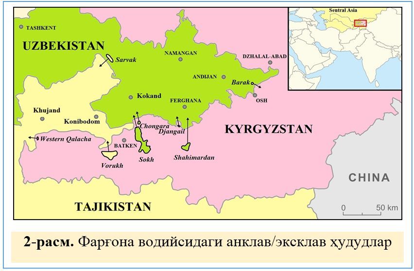 Специфическим наследием прошлых лет стала сохранившаяся в республиках Центральной Азии особая система анклавов. Внутри Киргизии находятся принадлежащие Узбекистану Сох, Шахимардан, Чон-Гара и Джангайл и принадлежащие Таджикистану Ворух и Западная Калача; а внутри Узбекистана — киргизский анклав Барак и таджикский Сарвак.