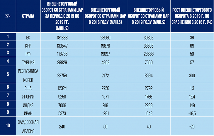 На основе статистики ЮНКТАД можно с разных сторон оценить властный потенциал торговых взаимоотношений. Анализ абсолютных показателей внешнеторгового оборота с 2015 по 2019 г. между нашей десяткой и странами ЦАР (Казахстан, Кыргызстан, Таджикистан, Туркменистан, Узбекистан) показывает следующие результаты: