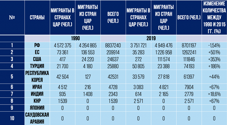На основе данных Отдела народонаселения департамента по экономическим и социальным вопросам ООН можно оценить властный потенциал миграционных процессов в отношениях между центральноазиатской пятёркой и выбранными десятью государствами.