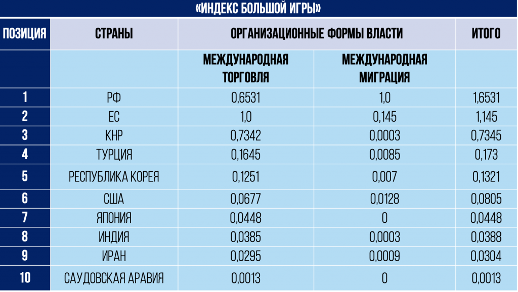 Отдавая дань экспертной конъюнктуре, можно назвать такой индекс – «Индекс Большой Игры». Если за единицу возьмём страновые показатели с наибольшими текущими значениями, то получится следующий промежуточный результат: