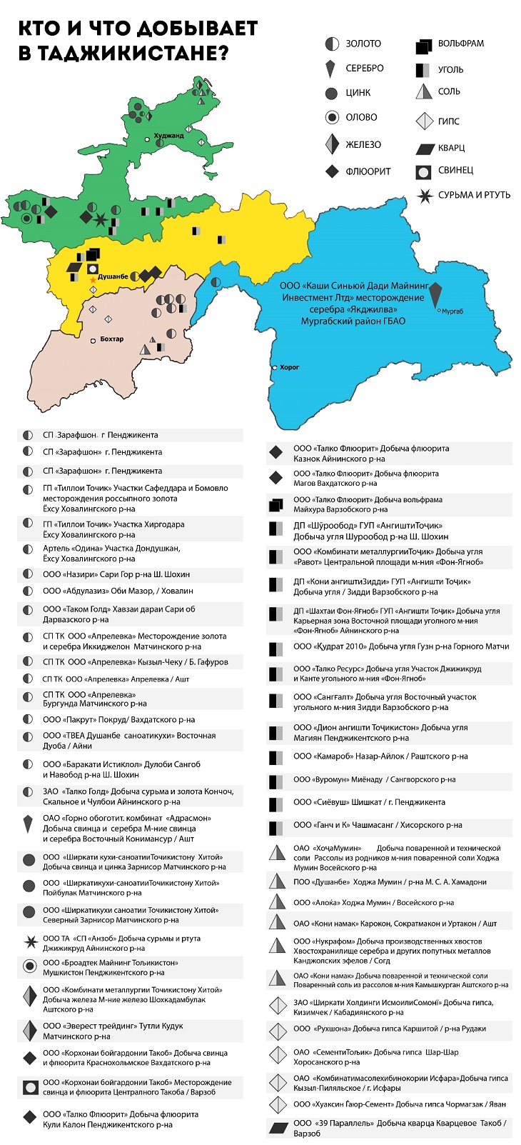 По его словам, Таджикистан обладает крупнейшими в Центральной Азии запасами серебра, много у нас золота, вольфрама, цинка, меди, висмута, кадмия, олова и других минералов.