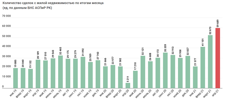 Сравнивать нынешние данные с показателями годичной давности вообще не стоит. В апреле 2020-го из-за введенных карантинных ограничений в Казахстане было совершено всего 5 211 сделок купли-продажи жилой недвижимости. Таким образом за год количество продаж выросло в 11,5 раз!