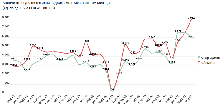 - Нур-Султан – 5962 сделки против 6579 в феврале и 6524 в марте.