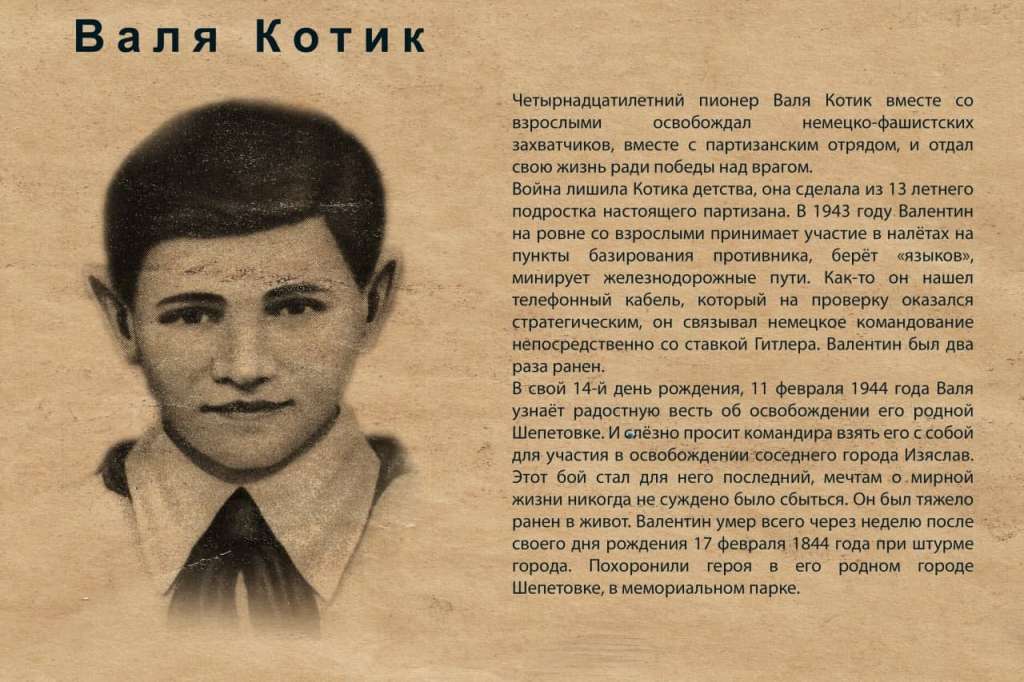 Валентин - юный герой-пионер. Валентину, искренне любившему Родину, пришлось жить по соседству с захватчиками, устанавливавшими собственные порядки. Поначалу мальчик втайне от родителей распространял листовки с военными сводками, сбрасываемые с советских самолетов, потом он со сверстниками решил помогать партизанам, прятавшимся в окрестных лесах. Однажды он на велосипеде провез мимо немцев найденный в окрестностях города пулемет. Валентин герой Советского Союза, награждён Орденом Ленина, Орденом Отечественной войны I степени, Медалью «Партизану отечественной войны» II степени — все эти награды он получил посмертно.