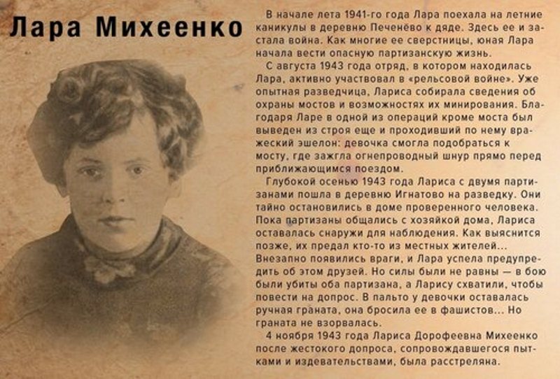 Лариса - партизанка, принимавшая участие в «рельсовой войне». Вместе с товарищами она регулярно взрывала железнодорожные линии, мосты и пускала под откос фашистские эшелоны. За свою последнюю вылазку она была представлена к правительственной награде, но получить ее не успела: она была казнена в возрасте 14 лет.