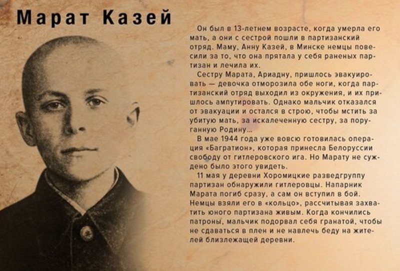 Марат - пионер-герой, юный красный партизан-разведчик. Подвиг Марата был отмечен почетной наградой – орденом Отечественной Войны первой степени, а также медалями «За боевые заслуги» и «За отвагу». В 1944 году начинается операция «Багратион», благодаря которой Беларусь освободили от фашистских захватчиков, чего не смог увидеть 14-летний Марат.