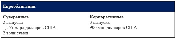 В феврале 2019 года Республика Узбекистан впервые в истории получила международный кредитный рейтинг (ВВ-) и разместила суверенные Еврооблигации на Лондонской фондовой бирже. Облигации были размещены двойным траншем по 500 млн долларов США со сроками погашения в 2024 и 2029 годах. Ставки купона пятилетних ценных бумаг установлены в размере 4,7% годовых, а десятилетних - 5,3% годовых.