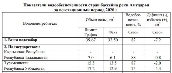 К слову, из бассейна другой трансграничной реки региона – Амударьи – Таджикистан в вегетационный период 2020 года забрал 6 млрд 100 млн кубометров воды, что почти на 13% меньше установленного лимита (7 млрд кубометров).