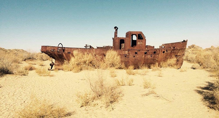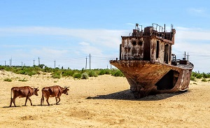 Аральское море относительно недавно было четвертым по величине озером в мире, занимая более 60 тыс. кв. км. Питали его воды рек Сырдарьи и Амударьи. Но нерациональное использование воды для орошения полей привело к гибели Арала. В 1989 году Арал распался на два водоема: Малое Аральское море (территория Казахстана) и Большое Аральское море (территория Узбекистана). В 1992 году Малое море было отгорожено от Большого Кокаральской плотиной, что и позволило его сохранить, но вызвало усыхание Большого Арала. В 2002 году Большое море сократилось и разделилось на восточное и западное.