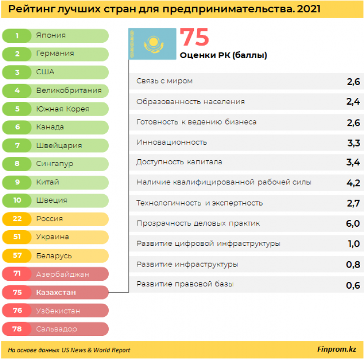 В рейтинге лучших стран для предпринимательства по версии US News & World Report в 2021 году Казахстан оказался на 75-м месте из 78. Оценка уровня развития предпринимательства в республике составила всего 0,9 балла из 100. Казахстан оценили низко по всем пунктам рейтинга, передает cronos.asia со ссылкой на Finprom.