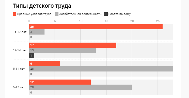 Такая разница в данных искажает реальную картину проблемы. Существующая система выявления детского труда и предотвращения наихудших форм детского труда неэффективна. При этом последняя программа по искоренению наихудших форм детского труда утратила силу в 2017 году, а новая до сих пор и не принята, сказала эксперт.
