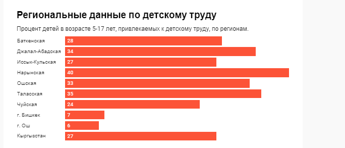 - По регионам самый высокий показатель детского труда в Нарынской области (40.5%), а самые низкие показатели в г. Бишкек (7.3%) и в г.Ош (6.1%).