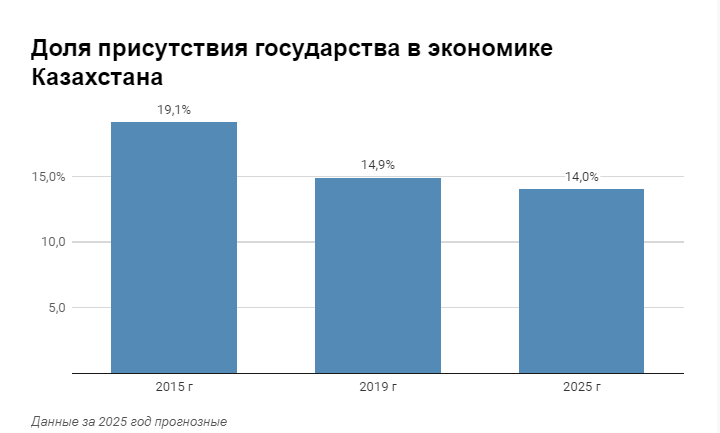 «На момент принятия комплексного плана приватизации на 2016-2020 годы, доля государства в экономике составляла 19,1%, а по итогам 2019 года – уже 14,9%. В связи с чем, полагаем, основная цель достигнута, что свидетельствует об эффективности проведения приватизации последних пяти лет. К концу 2025 года планируется сократить долю участия государства в экономике до 14%», - сообщил в ответе на запрос руководитель Комитета госимущества и приватизации Бакытбек Ташенев.