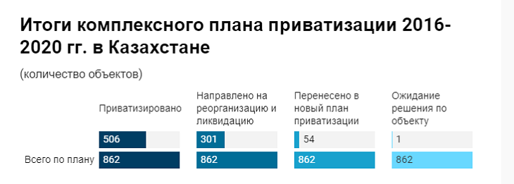 Особый интерес вызывают кампании по приватизации последнего десятилетия. За этот период было реализовано два комплексных плана. За период первого – с 2014 по 2016 годы – было запланировано к реализации 833 объекта. Из них, согласно данным Министерства финансов РК, продано всего 239 или 29%.
