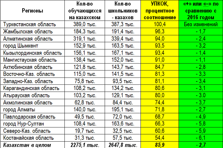 И потом, например, в Нур-Султане значительную часть жителей составляют «титульные» выходцы с юга, который в гораздо меньшей степени подвергся русификации, но, тем не менее, в столице соотношение между количеством учащихся казахских классов и общим количеством школьников-казахов намного ниже, чем в целом по республике и даже чем в Алматы. К тому же главный город страны является одним из трех лидеров (или анти-лидеров?) по темпам снижения УПКОК – 5,8 процентных пункта за пять лет.