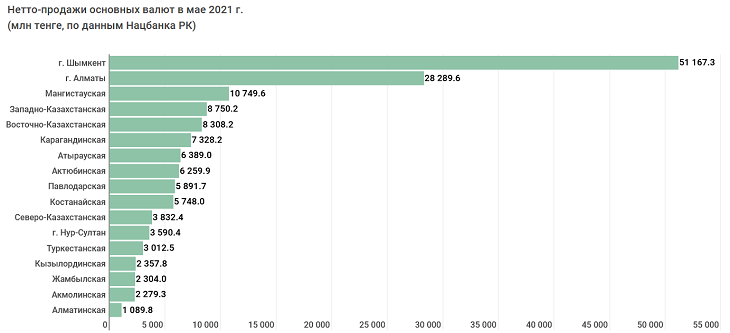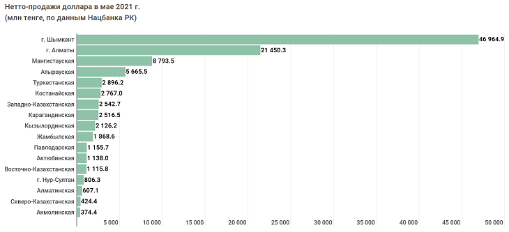 Активнее всего в мае валютой запасались в Шымкенте. За месяц объем нетто-продаж составил 51,2 млрд тенге. То есть почти треть от общереспубликанского уровня. На втором месте с большим отставанием идет Алматы – 28,3 млрд.