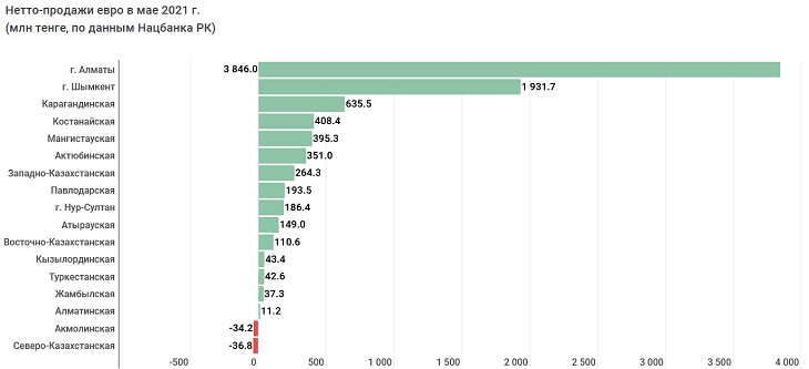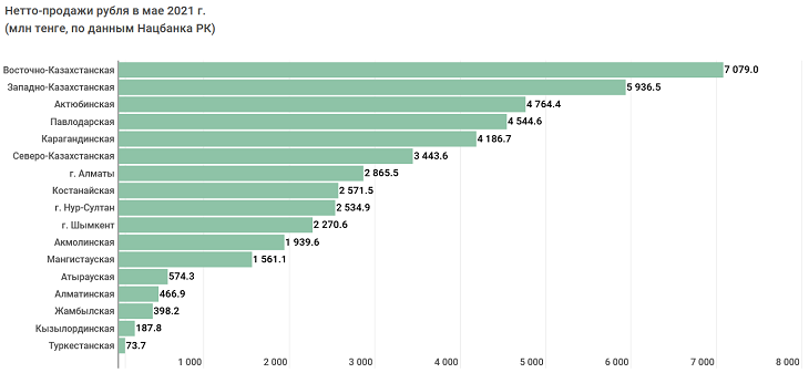 Зато в Мангыстауской области рубль оказался весьма востребован. Подобный объем нетто-продаж в этом регионе не наблюдался с февраля 2020 года.