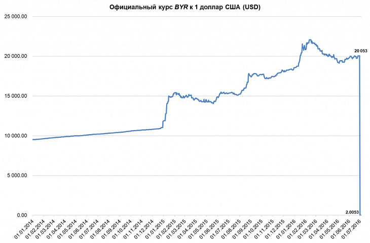 Беларусь. Решение о деноминации было вызвано быстрой инфляцией и резким обесцениванием валюты с 2011 года. По состоянию на 31.12.2014 г. официальный курс белорусского рубля (BYR) составил 11 850 рублей по отношению к 1 доллару США. За год курс BYR обесценился на 56,7%. На 30.06.2016 г. девальвация составила 8%.