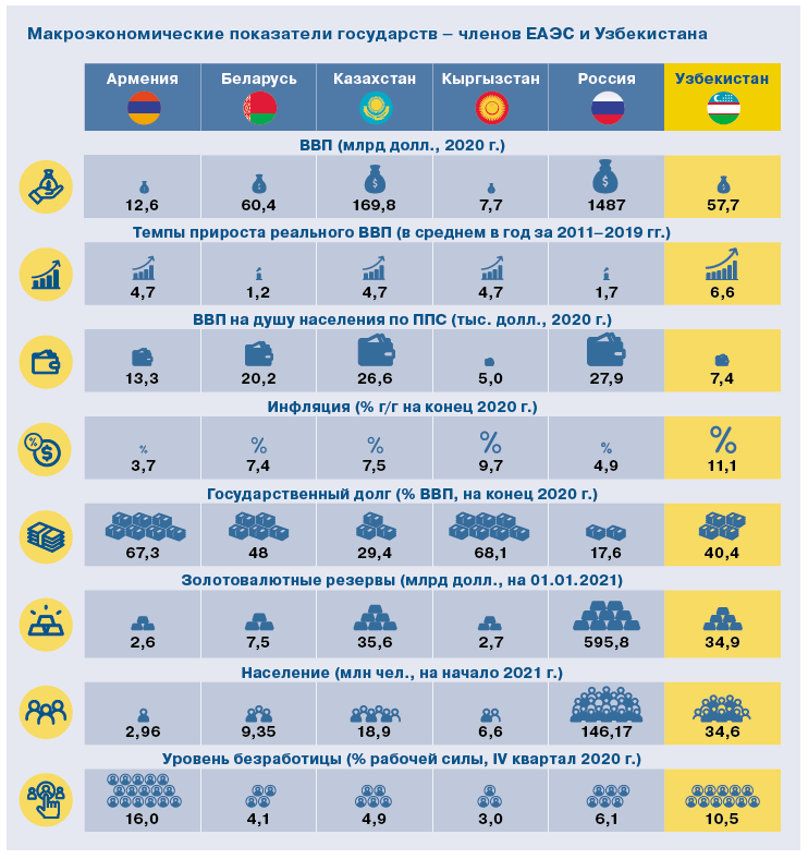 Как отметили аналитики ЕАБР, на сегодняшний день Узбекистан обладает одной из крупнейших экономик Центральной Азии. Его валовой внутренний продукт за 2020 г. составляет $57,7 млрд и в регионе уступает лишь Казахстану. Важным экономическим показателем являются и темпы роста реального ВВП Узбекистана – за период 2011-2019 гг. в среднем они составили 6,6%, что выше, чем у всех стран-участниц ЕАЭС. Однако на фоне пандемии коронавируса в 2020 г. темпы роста узбекистанской экономики снизились до 5,5%.