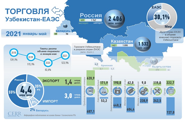 Изменения, которые произошли в торговле Узбекистана со странами Евразийского экономического союза (ЕАЭС) представлены в инфографике Центра экономических исследований и реформ (ЦЭИР).