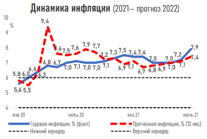 С инфляцией обстоит немного по другому. Поскольку она выросла до 7,9 процентов годовых в июне 2021 года, то и прогноз динамики ухудшился. Ранее средняя оценка ожидаемой в 2022 инфляции была 7,1%. Теперь же она выросла до 7,4%. Таким образом, констатировали эксперты, «инфляционные ожидания сохраняются повышенными».