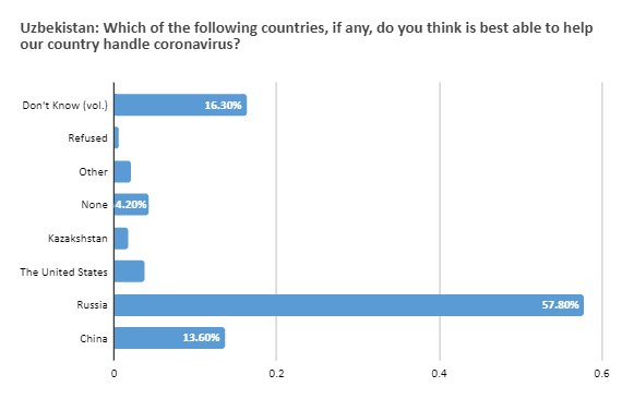 Результаты опроса в Узбекистане на тему какое из следующих государств наиболее надежный партнер в помощи против пандемии COVID-19