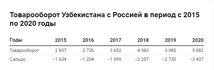 Как видно из таблицы, рост товарооборота происходит в большей степени за счет импорта из России. Только в 2020 году отрицательное для Узбекистана сальдо увеличилось на 25,89% (707 010 864 долларов США), импорт возрос на 19,24%, в то время как рост экспорта в Россию составил 3,82% по сравнению с 2019 годом.