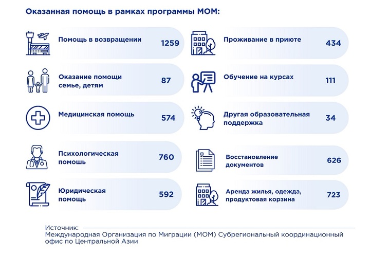 На декабрь 2020 года 1891 жертвы торговли людьми получили реабилитацию и реинтеграционнную помощь. Из общего числа пострадавших 944 человек были из Узбекистана, 744 - граждане Казахстана и 72 человек - из Киргизии. Большинство жертв были вовлечены в трудовую эксплуатацию – 60,9% (1151 человек) и сексуальную эксплуатацию – 37,6% (711 человек). 1,5% эксплуатации пришлись на такие виды, как попрошайничество, принудительные роды для следующего незаконного усыновления, принуждение к незаконному изъятию или изъятию органов и тканей человека и другие.