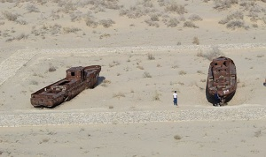 Когда вы приедете в Муйнак, то увидите «кладбище кораблей». Это то самое знаменитое место, где туристам показывают причаленные в песок заржавевшие корабли. Быть может, вы думаете, ну да высох! Но, к сожалению, это не единственная трагедия Арала. Проехав дальше часа 3-4, вы доберетесь до дна высохшего Арала. Издали виден сильный вихрь ― это штормит на дне соляная буря. Подъехав поближе, вы увидите заболоченное место. Тут-то и возникнет закономерный вопрос: «А где Арал?».