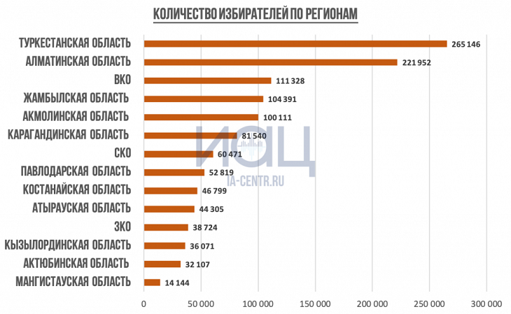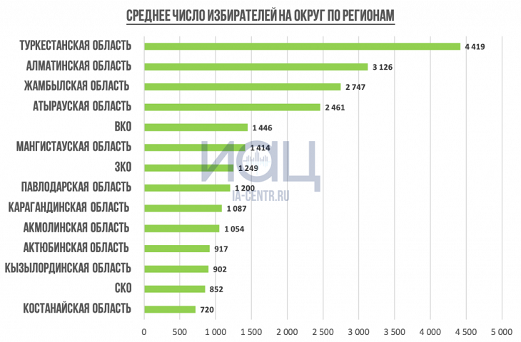 Однако распределение по количеству избирателей, которые живут в округе, совсем другое – южные области тут выигрывают. В среднем на регион приходится 86,4 тысячи избирателей, которые должны участвовать в выборах акима. Тут выявляется специфика Туркестанской и Алматинской областей, где распространены так называемые «села-гиганты», то есть сельские населенные пункты с численностью более 10 тысяч человек.