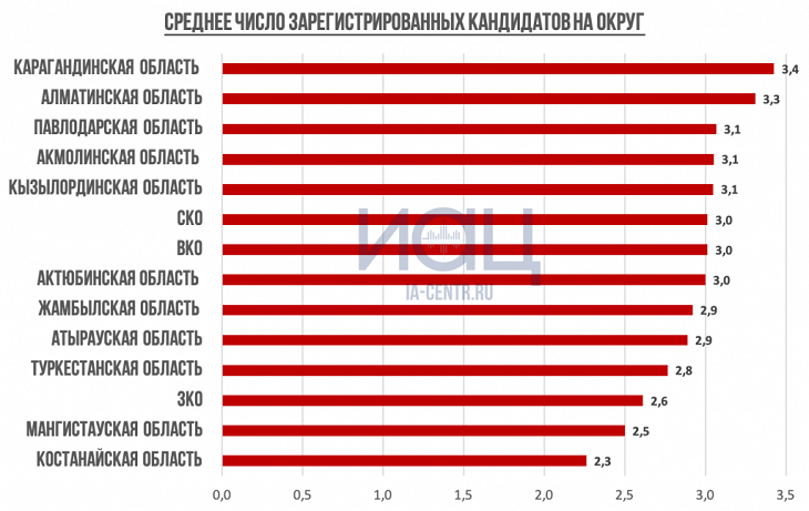 В итоге получилось 2,98 (около 3) кандидатов в среднем на один округ. Если же брать по регионам, то там результаты колеблется от 2,3 кандидатов в Костанайской области до 3,4 кандидатов в Карагандинской области. В некоторых округах доходило до 6 кандидатов, практически нигде не нужно было использовать добавленного кандидата от акима района, чтобы была конкуренция.