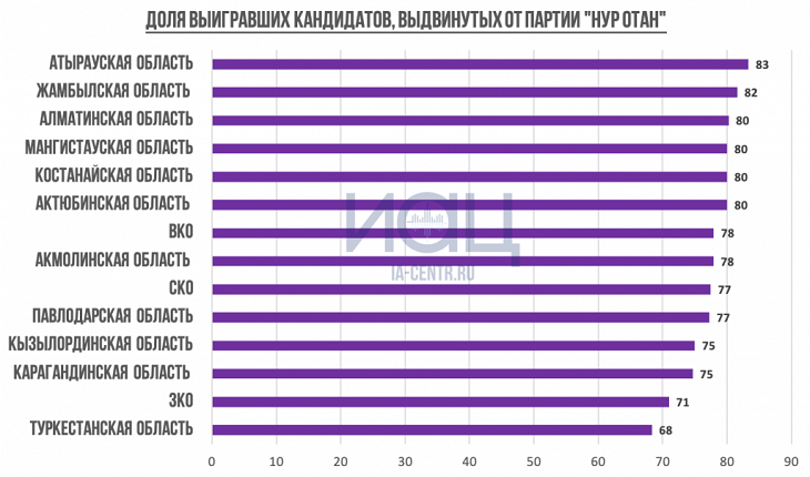 Надо еще учитывать, что среди 98 самовыдвиженцев было 65 членов партии «Нур Отан», так что реальная доля партии выше – 628 акимов из 730 или 86%.