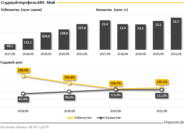 Годовые темпы роста ссудного портфеля банковского сектора в соседнем Узбекистане также выше, чем в Казахстане. Так, за последний год портфель займов БВУ РК вырос на 11%, до 16,7 трлн тг, в то время как в Узбекистане показатель увеличился сразу на 25,1%, до 297,8 трлн сумов.
