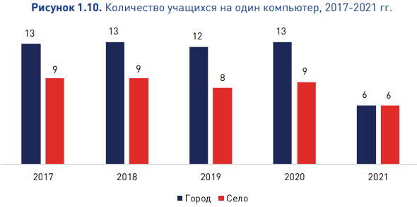 Количество учащихся на один компьютер в 2021 году как в сельских школах, так и в городских — 6 человек. При этом за пять лет показатель в городской местности снизился почти в два раза.