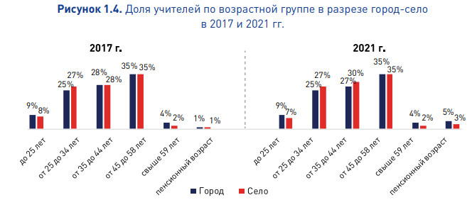 Доля учителей старше 59 лет и пенсионного возраста в городских школах выше. Так, в 2021 году в городе 9%, в селе – 5%.