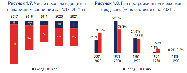 У сельских школ значительно слабее инфраструктура и больше школ в аварийном состоянии (25 против 11 в городах). Вместе с тем авторы отметили существенное снижение общей численности аварийных школ за последние пять лет.