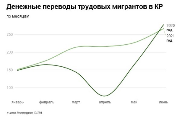 Национальный банк Кыргызстана приводит данные о том, что только в прошлом месяце в КР поступило $266.9 млн, что на 17.47% большем, чем месяцем ранее, но почти на 4% меньше, чем в аналогичном периоде 2020 года.