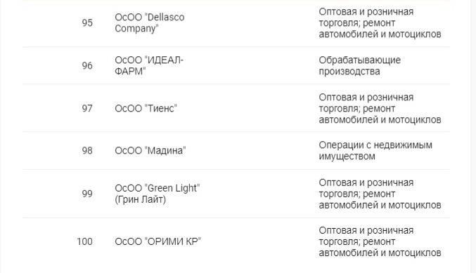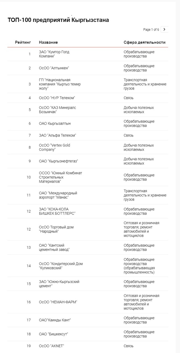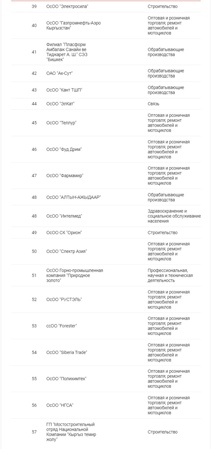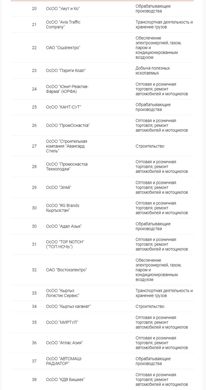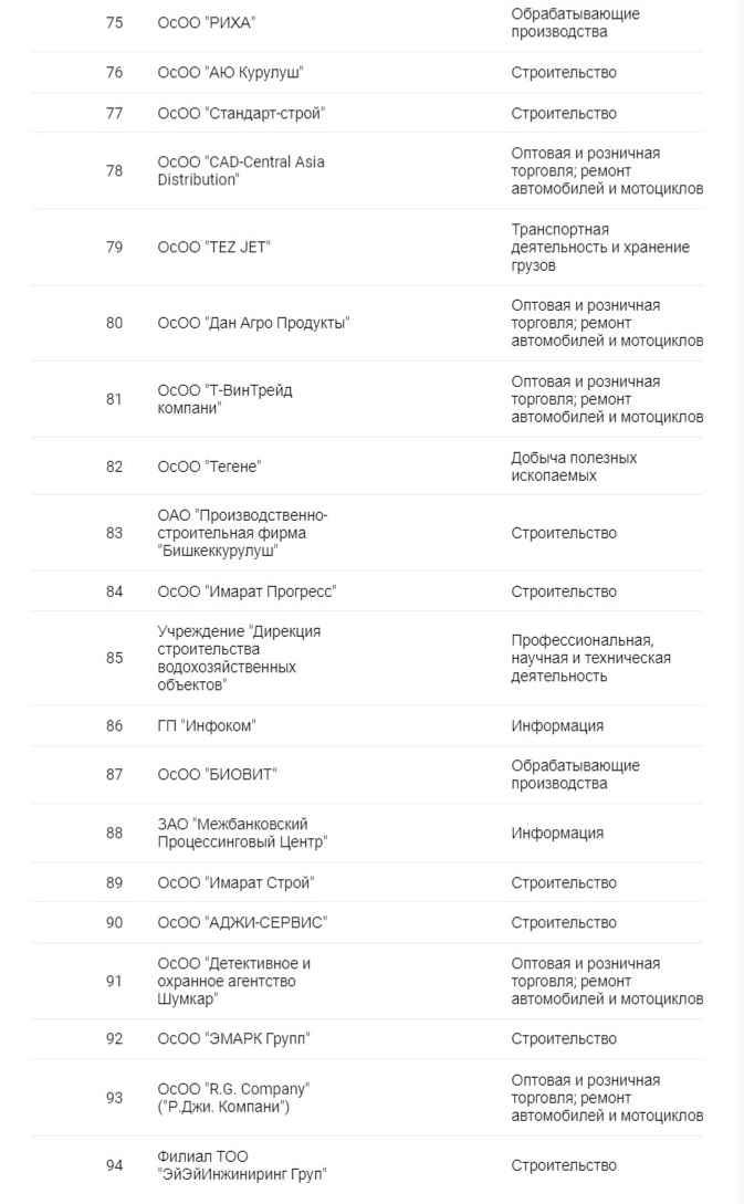 Лидерами списка стали золотодобывающие компании «Кумтор» и «Алтынкен», замкнула тройку лучших ГП «Национальная компания «Кыргыз темир жолу».