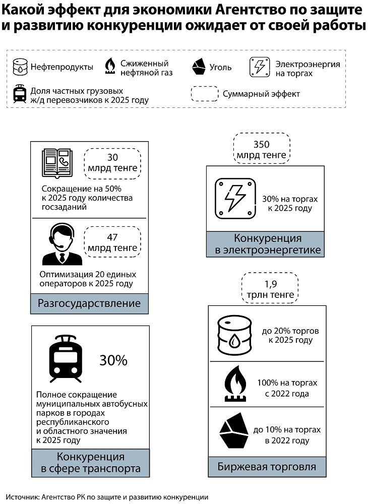 Примерами являются стоматологии, охранные предприятия, транспортные службы и предприятия благоустройства. Благодаря этому, как говорится в презентации Серика Жумангарина, госучастие может сократиться с 14,8% сразу до 14% к 2025 году.