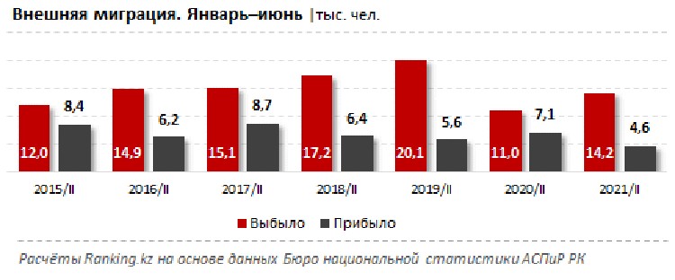 За январь–июнь 2021 года в страну прибыло 4,6 тыс. человек — сразу на 34,9% меньше, чем за январь–июнь 2020-го, говорится в исследовании Ranking.kz.
