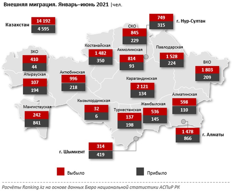 В региональном разрезе больше всего граждан выбыло из Карагандинской области: 2,1 тыс. человек — на 37,5% больше, чем годом ранее. На второй и третьей строчке расположились Восточно-Казахстанская (1,8 тыс. человек, плюс 12,6% за год) и Павлодарская (1,5 тыс. человек, 18,8%) области. Меньше всего жителей выбыло из Кызылординской области: 32 человека, плюс 68,4% за год.