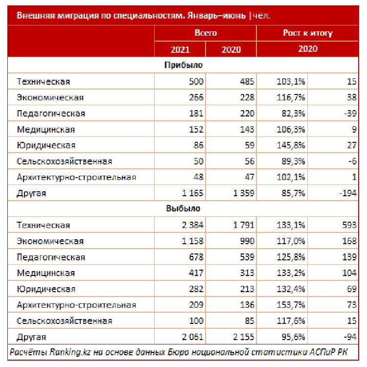 Разница между числом выбывших и прибывших специалистов технических специальностей составила 4,8 раза, экономических — 4,4 раза, педагогических — 3,7 раза, медицинских — 2,7 раза, юридических — 3,3 раза, сельскохозяйственных — 4,2 раза, архитектурных — 2,1 раза.