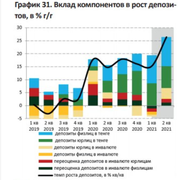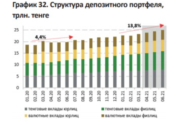 Во втором квартале 2021 года объем депозитов продолжил расти, причем как тенговых, так и валютных. Нацбанк сообщил, что если последние выросли за счет корпоративного сектора, то в тенговые вкладывались больше сограждане.