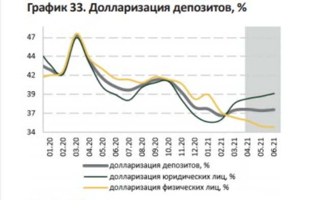 Общий уровень долларизации с марта 2021 сохраняется на уровне 37%. Для сравнения, 37,3% в декабре 2020 года, 40% — в июне 2020. Хотя если речь идет о крупных вкладах (более 50 млн тенге), здесь уровень долларизации практически в два раза превышает общий.