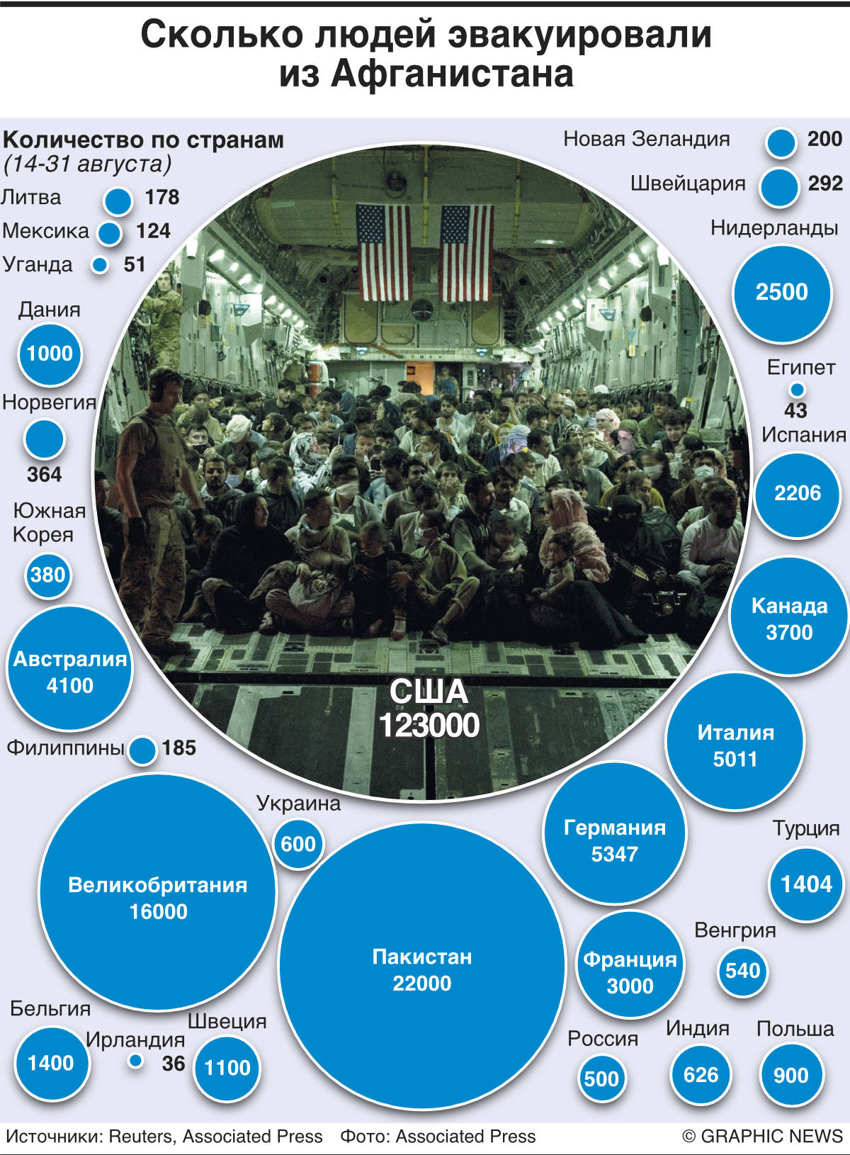 После прихода к власти в Афганистане террористического движения «Талибан» (запрещено в РФ) из страны было эвакуировано свыше 196 тыс. иностранцев и афганцев. Какие страны вывезли больше всего людей — в инфографике “Ъ”.