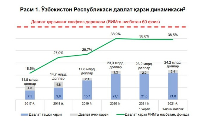 Государственный долг Узбекистана по итогам I полугодия 2021 года составил $24,2 млрд, следует из данных Министерства финансов.